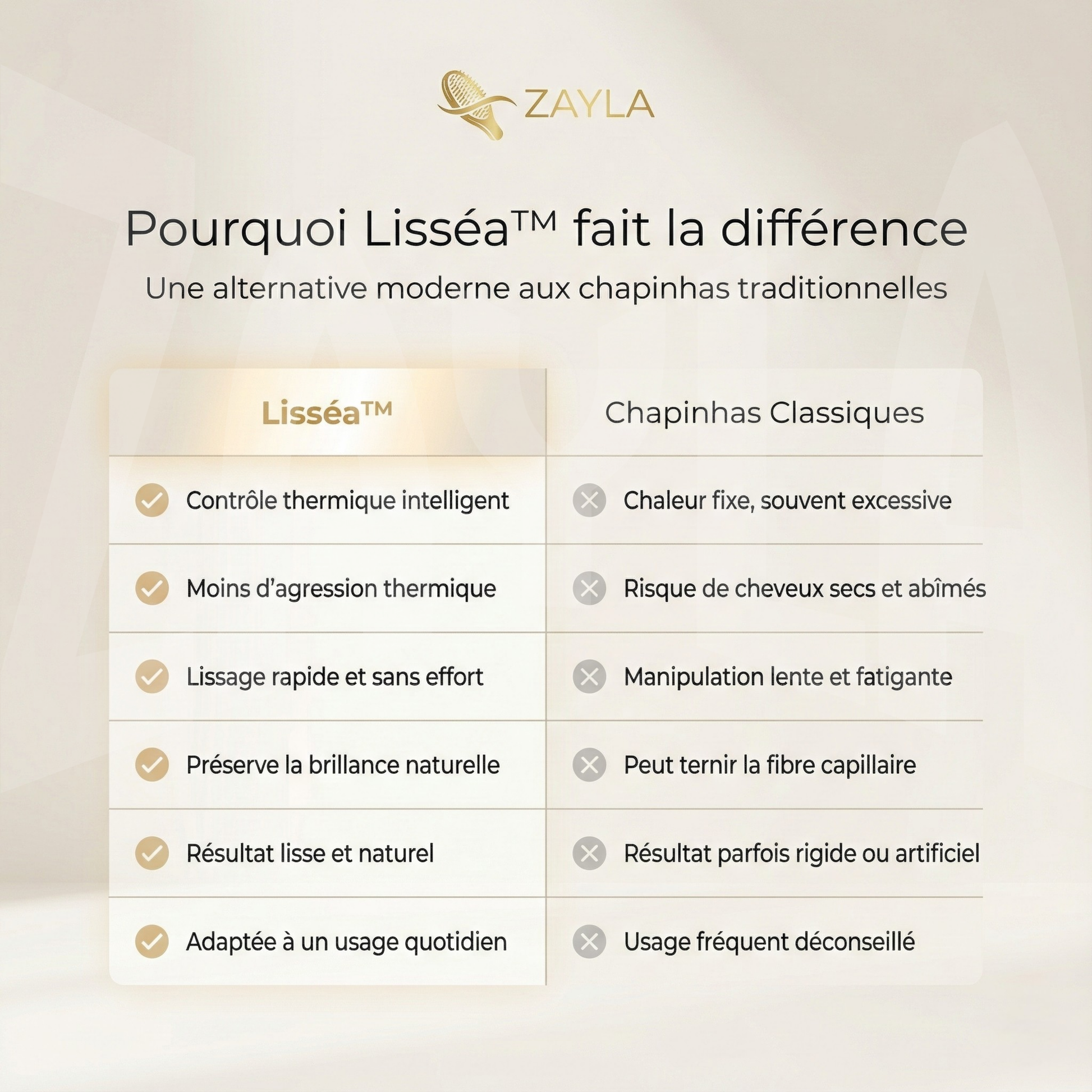 Oui. La Lisséa™ a été conçue pour discipliner et lisser les cheveux avec beaucoup moins d’agression thermique qu’un lisseur classique. Là où le lisseur écrase et force la fibre capillaire, la Lisséa™ guide le cheveu avec précision, offrant un résultat plus naturel, léger et confortable au quotidien.
